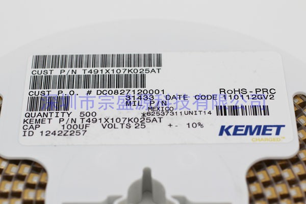 產品名稱:KEMET鉭電容 7343 25V 100UF X型 T491X107K025AT