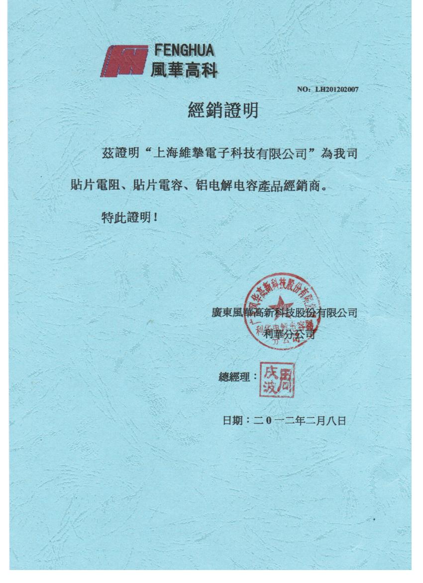 熱烈慶祝深圳市宗盛源科技有限公司上海子公司“上海維摯電子科技有限公司”成為風華高新科技股份有限公司所有系列貼片電阻、貼片電容以及鋁電解電容產品經銷商。