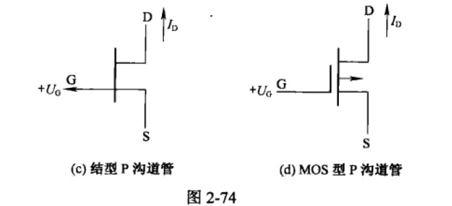 場效應晶體管通常簡稱為場效應管,是一種利用場效應原理工作的半導體器件。場效應管的文字符號是“VT”,場效應管分為結型場效應管和絕緣柵場效應管(MOS管)兩大類,又都有N溝道和P溝道之分。結型和耗盡型MOS管正常工作時,N溝道管應加負柵壓,P溝道管應加正柵壓,如圖2-74所示。