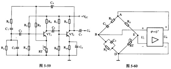 2.正反饋網絡和負反饋網絡正好構成了電橋電路,如圖5-60所示。VT1、VT2組成相移角的放大器,電橋的A、D端接放大器輸出端,B、E端接放大器輸入端。當信號頻率等于R1、C1和R2、C2正反饋網絡的諧振頻率時,放大器輸出電壓Uo與反饋到輸入端的電壓Ui相同,電路振蕩。