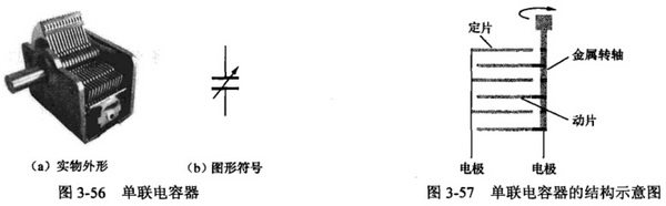 1.單聯電容器是由多個連接在一起的金屬片作定片,以多個與金屬轉軸連接的金屬片作動片構成。單聯電容器的實物和圖形符號如圖3-56所示。