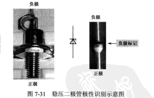 識(shí)別穩(wěn)壓二極管的各引腳有下列兩種方法:(1)通過穩(wěn)壓二極管外形特征和管殼上的各種標(biāo)記,可以識(shí)別各種穩(wěn)壓二極管的正、負(fù)引肝鄧。例如,有的穩(wěn)壓二極管上直接標(biāo)出圖形符號(hào),塑料封閉的穩(wěn)壓二極管有標(biāo)記的一端為負(fù)極,金屬封裝穩(wěn)壓二極管半圓面的一端為負(fù)極,平面的一端為正極,如圖7-31所示。(2)用萬用表來檢測的方法。穩(wěn)壓二極管也是一個(gè)PN結(jié)的結(jié)構(gòu),所以運(yùn)用萬用表歐姆擋測量PN結(jié)的正向和反向電阻可以分辨正、負(fù)引腳。
