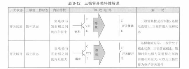 三極管同二極管一樣,也可以作為電子開關器件,構成電子開關電路。當三極管用于開關電路中時,三極管工作在截止、飽和兩個狀態,詳細情況如表8-12所示。