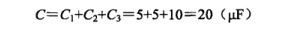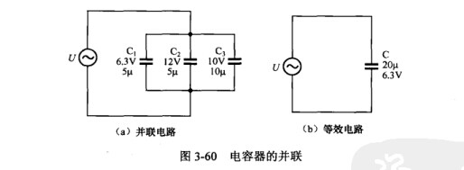 電容器并聯(lián)后的總耐壓以耐壓最小的電容器的耐壓為準(zhǔn),仍以圖3-60(a)所示電路為例,C1、C2、C3耐壓不同,其中C1的耐壓最小,故并聯(lián)后電容器的總耐壓以C1耐壓6.3V為準(zhǔn),加在并聯(lián)電容器兩端的電壓不能超過6.3V。