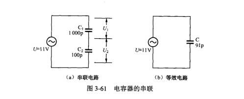 電容器串聯(lián)后總耐壓增大,總耐壓較耐壓最低的電容器的耐壓要高。在電路中,串聯(lián)的各電容器兩端隨的電壓與容量成反比,即容量越大,在電路中隨電壓越低,這個(gè)關(guān)系可用公式表示: