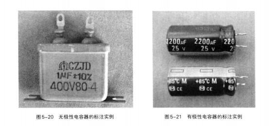 ②電容器的標注方法   下面具體看一下電容器的標注方法。在實際電容器表面,也可以找到與電子電路圖中對應的標識信息,通常標識有電容器的電容量,有極性的電容器還標有負極性。下面選取典型電容器分別介紹電容器實物的標識方法。