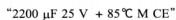 該電容標識為。其中"2200uF"表示電容量大小;"25V"表示電容的額定工作電壓;"+85度"表示電容器正常工作的溫度范圍;"M"表示允許偏差為±20%;"C"表示電容;"E"表示其他材料電解電容。所以該電容標識為:其他材料電解電容,大小為2200uF,正常工作溫度不超過+85度。由于電容器直標法采用的是簡略方式,因此只標識出重要的信息,有些則被省略。