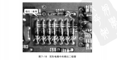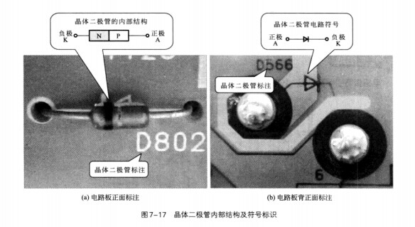 可以看到,D802和D566即為晶體二極管。由于晶體二極管有極性的區分,對于小功率晶體二極管來說,如圖7-17(a)所示,在晶體二極管的表面,靠近左端的引腳有一個色環標注,這表明該端引腳為晶體二極管的K極(負極),另一端即為晶體二極管的正極。此外,在電路板上,有時也可以通過晶體二極管的電路符號標注來判別晶體二極管及其引腳極性。如圖7-17(b)所示,在電路板的背面,可以通過"D566"來判別這是一個晶體二極管,而通過符號標注便可以清楚的知道該二極管的引腳極性。