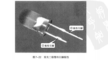 通常情況下,發光二極管可以通過引腳的長短來判別極性。如圖7-22所示,引腳相對較長的一端為發光二極管的A極(正極),較短的一端為二極管的K極(負極)。