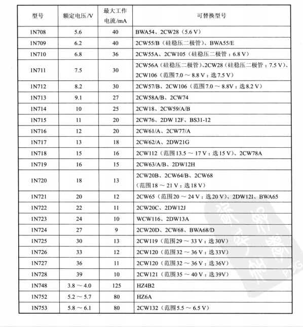 常見穩壓二極管型號及可替換型號見表7-8所列。