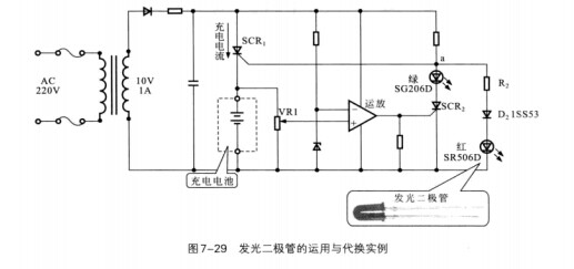 圖中選用發光二極管SG206D和SR506D作為指示,交流220V電壓經變壓器后,降為10V,再經整流濾波后形成直流電壓,分別加到晶閘管(可控硅SCR1)和顯示控制電路。電源接通后A點的電壓上升,該電壓觸發晶閘管給電池充電,同時紅色發光二極管有電流,二極管發光表示開始充電。當充電到達額定值時是,電池兩端的電壓上升,使電位器VR1的滑片電壓上升,運算放大器的正端電壓上升,運放輸出高電壓使晶閘管SCR2導通,綠色發光二極管發光,A點電壓下降,停止充電,紅色發光二極管熄滅。