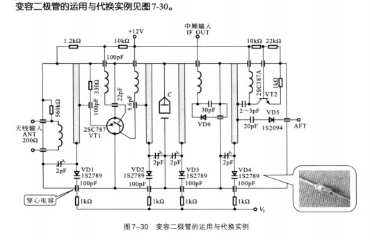 電子調諧式U頻段電視機接收電路,VD1-VD4為變容二極管1S2789。它是由高頻放大器、混頻和本機振蕩電路構成的。天線接收的信號經扁平電纜加到輸入線圈上,經腔體諧振電路耦合到高放晶體管VT1的發射極,放大后由集電極輸出,經雙調諧電路耦合到混頻級VD6。由VT2和調諧電路構成本機振蕩電路。本振電路也將本振信號送到混頻電路,混頻后由1F端輸出中頻信號。VD2-VD4為諧振電路中的變容二極管,VT端為調諧電壓輸入端。VD5為本振電路中的變容二極管,AFT電壓加到VD5上對本振頻率進行微調。在代換變容二極管時應盡量選擇同型號的變容二極管并注意極性以確保變容二極管的性能。