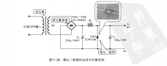 在直流穩壓電路中,VD5為穩壓二極管,其型號為2CW21B。交流220V電壓經變壓器降壓后輸出8V交流低壓,8V交流電壓經橋式整流堆輸出約11V直流電壓,再經C1濾波,R2、VD5穩壓,穩壓值為6V,C2濾波后輸出6V穩壓直流。在穩壓二極管代換時,盡量選擇同類型同型號的穩壓二極管。