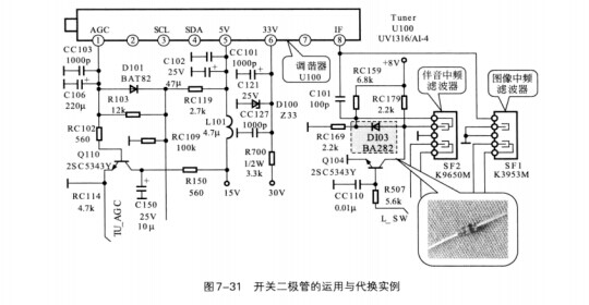 電視機調諧器及中頻電路中,D103為型號BA282的開關二極管,經查表,該二極管為P型鍺材料高頻大功率管(F>3MHZ,PC>1W)。在聲表面波濾波器前級,通常會選用一只開關二極管,作為其開關控制器件。在代換時應注意極性,以保證開關二極管的功能。