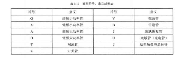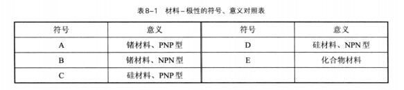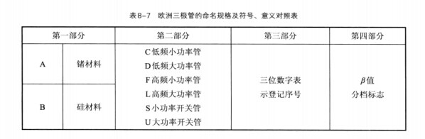 對于歐洲生產的三極管,命名規格見表8-7所列。
