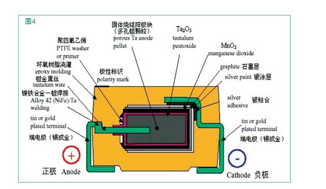 結(jié)成一多孔的堅實芯塊(圓柱形狀),芯塊經(jīng)過陽極化處理生成氧化膜TA2O5,再被覆固體電解質(zhì)MNO2,然后