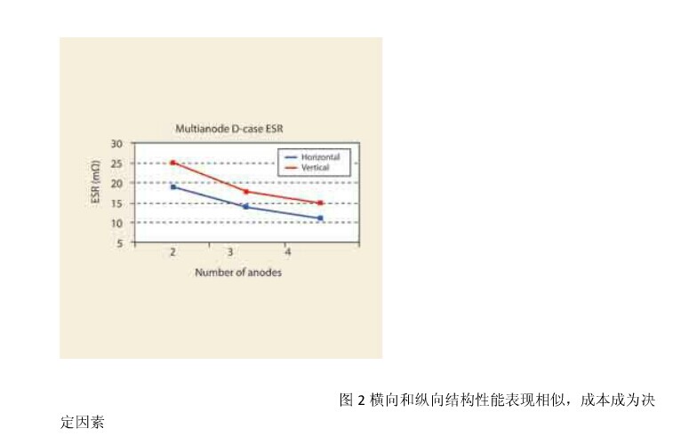 橫向和縱向結構兩者ESR性能之間的差異如圖2所示。這個例子是基于對D類電容器的理論計算,圖2表明,兩陽極橫向結構與三陽極系統的縱向結構的ESR值相似。然而,相對而言橫向結構在ESR上性價比優勢更顯著。